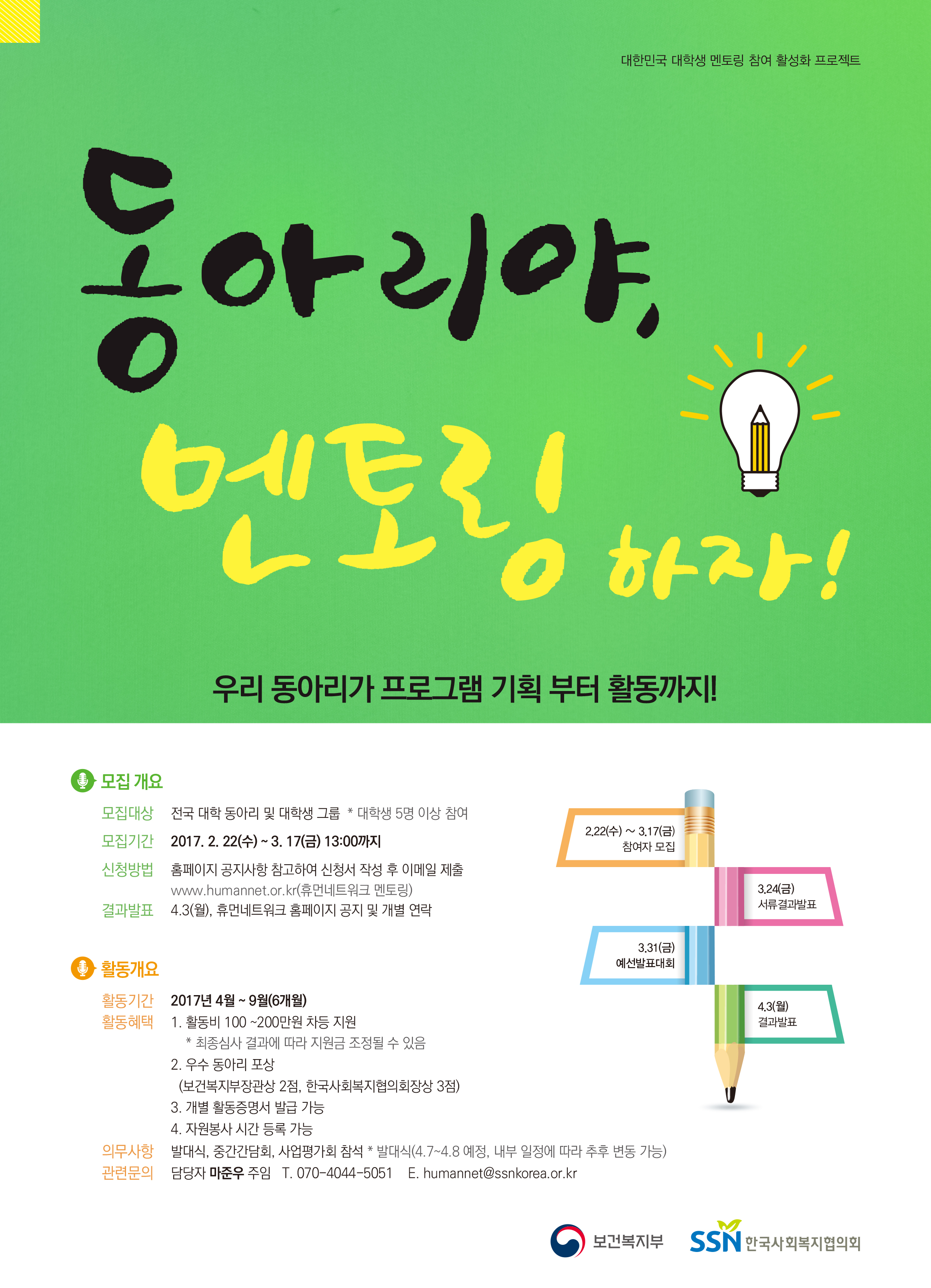 한국사회복지협의회 휴먼네트워크사업단은 대학생 멘토링 참여를 통한 다양한 우수사례 발굴을 위해서