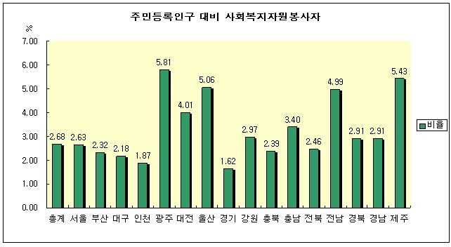 자원봉사 참여자 수는 서울(271,117명), 경기(191,378명)가 많고 주민등록인구 대비 자원봉사자 비율은 광주(5.8%), 제주(5.4%), 울산(5.0%), 전남(4.9%)등이 높은 편이다.