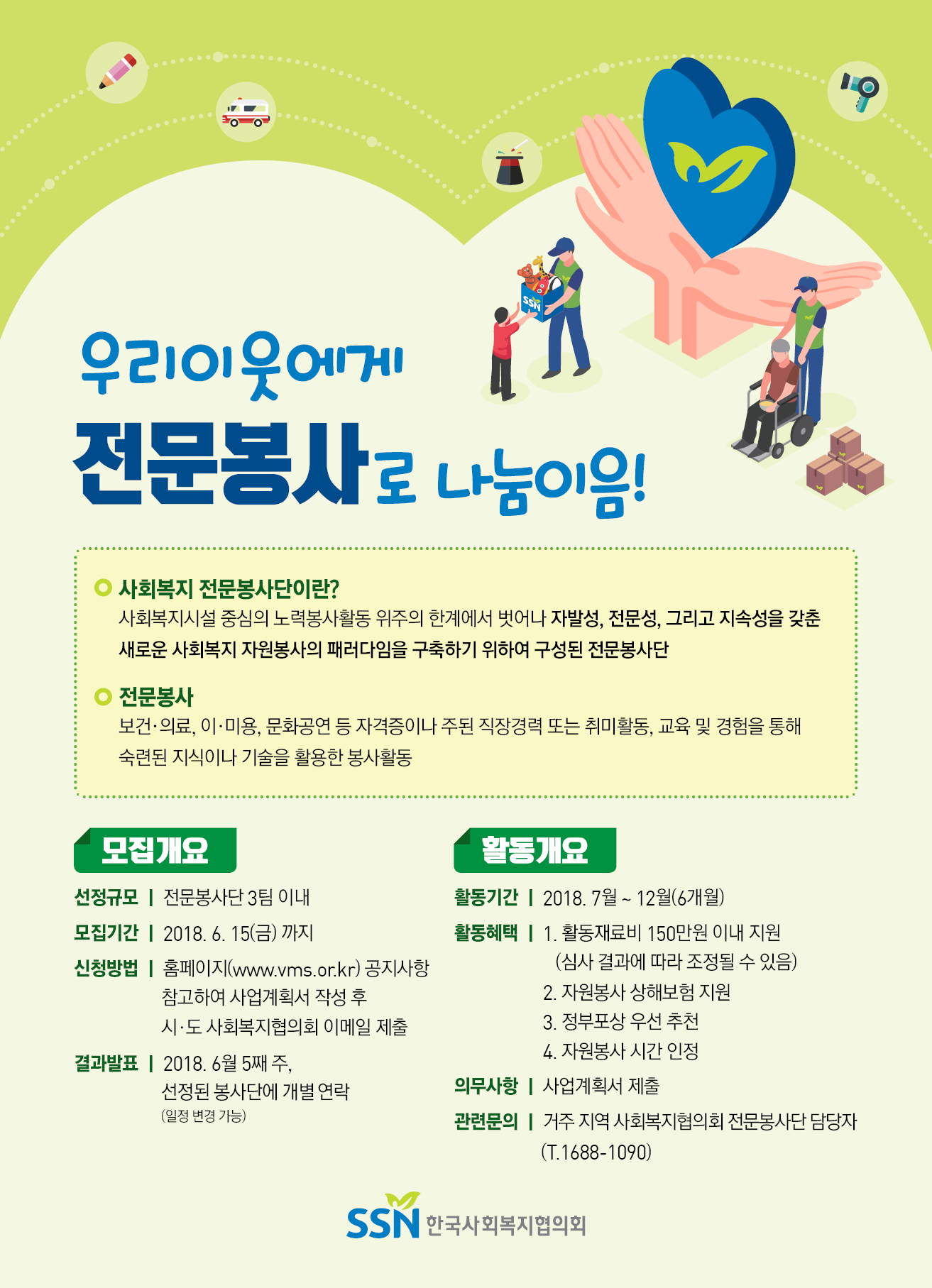 2018년 사회복지자원봉사 전문봉사단(지역사회봉사단)을 다음과 같이 공모하오니 전문 재능*을 활용한 봉사활동이 가능한 단체·동아리의 적극적인 참여를 바랍니다.
